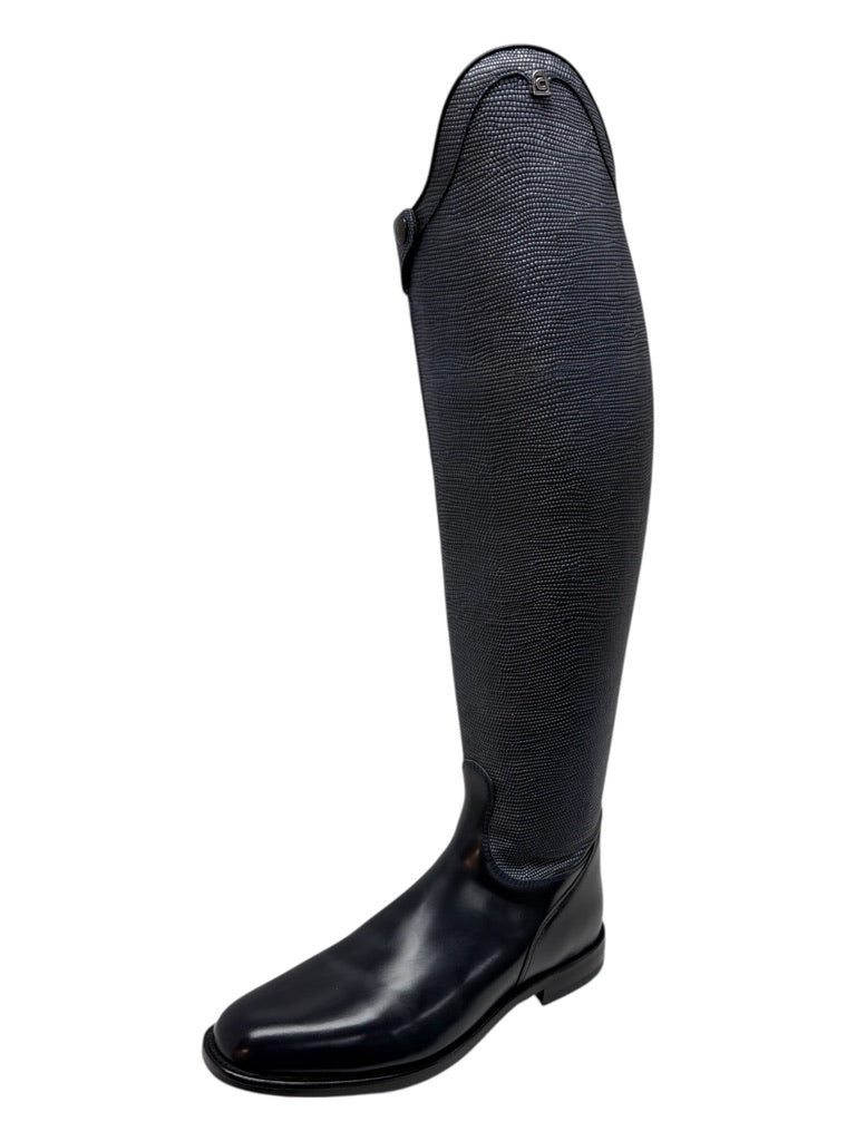 These stunning navy boots have an unusual blue patterned outer shaft, with the lovely soft, durable, extra grip leather on the inside.