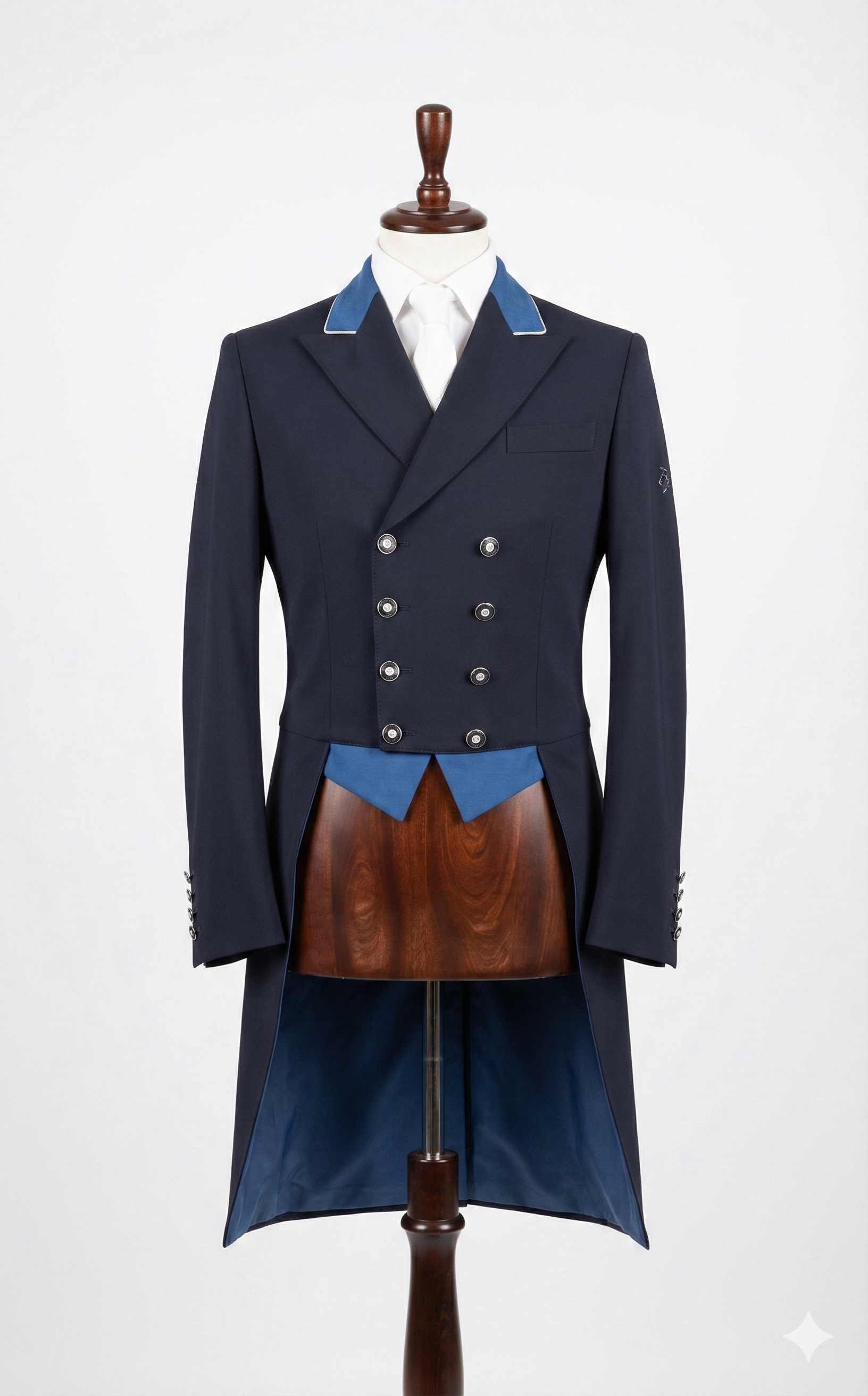 We have modernised the traditional men’s design by evolving the classic three-row configuration into four rows of buttons, creating a stronger vertical axis through the torso. By subtly extending the front panels, we achieve a seamless visual transition between rider and horse — enhancing symmetry, presence, and proportion in the arena.