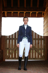 This is a fractionally lighter weight cloth and a beautiful classical fabric to wear due to the wool content. It however, does not have quite the same amount of elastane as our own fabric but is machine washable. Still offering the perfect freedom of movement, yet still holding classical lines whilst worn. This fabric is a dream to ride in whatever the climate.